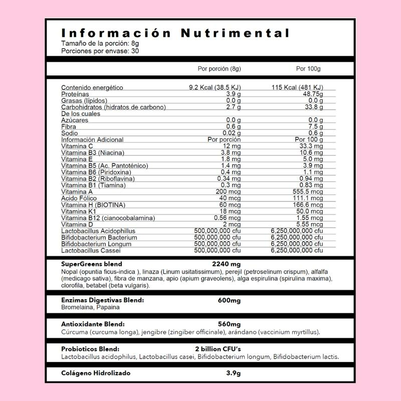 Colágeno, super verdes y probióticos para piel, digestión y energía diaria