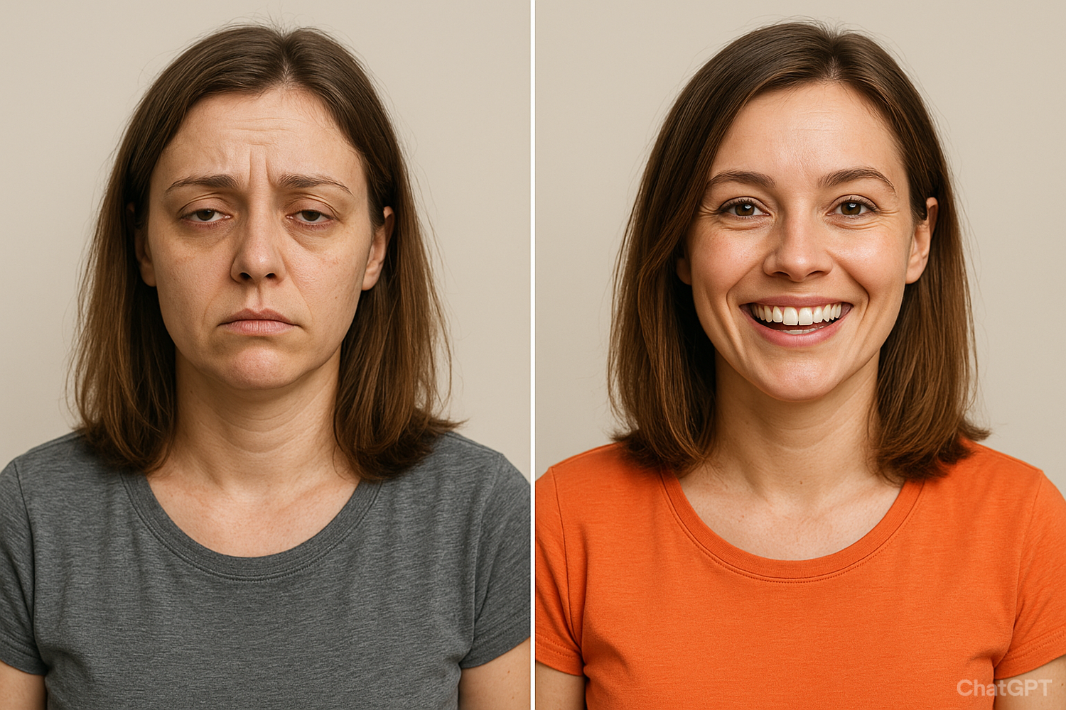 En la imagen vemos un claro antes y después: a la izquierda, el cansancio se nota en la mirada apagada y la postura vencida. A la derecha, todo cambia — piel más fresca, ojos despiertos y energía en la expresión. Esa transformación es lo que muchos experimentan al darle al cuerpo el magnesio que necesita.